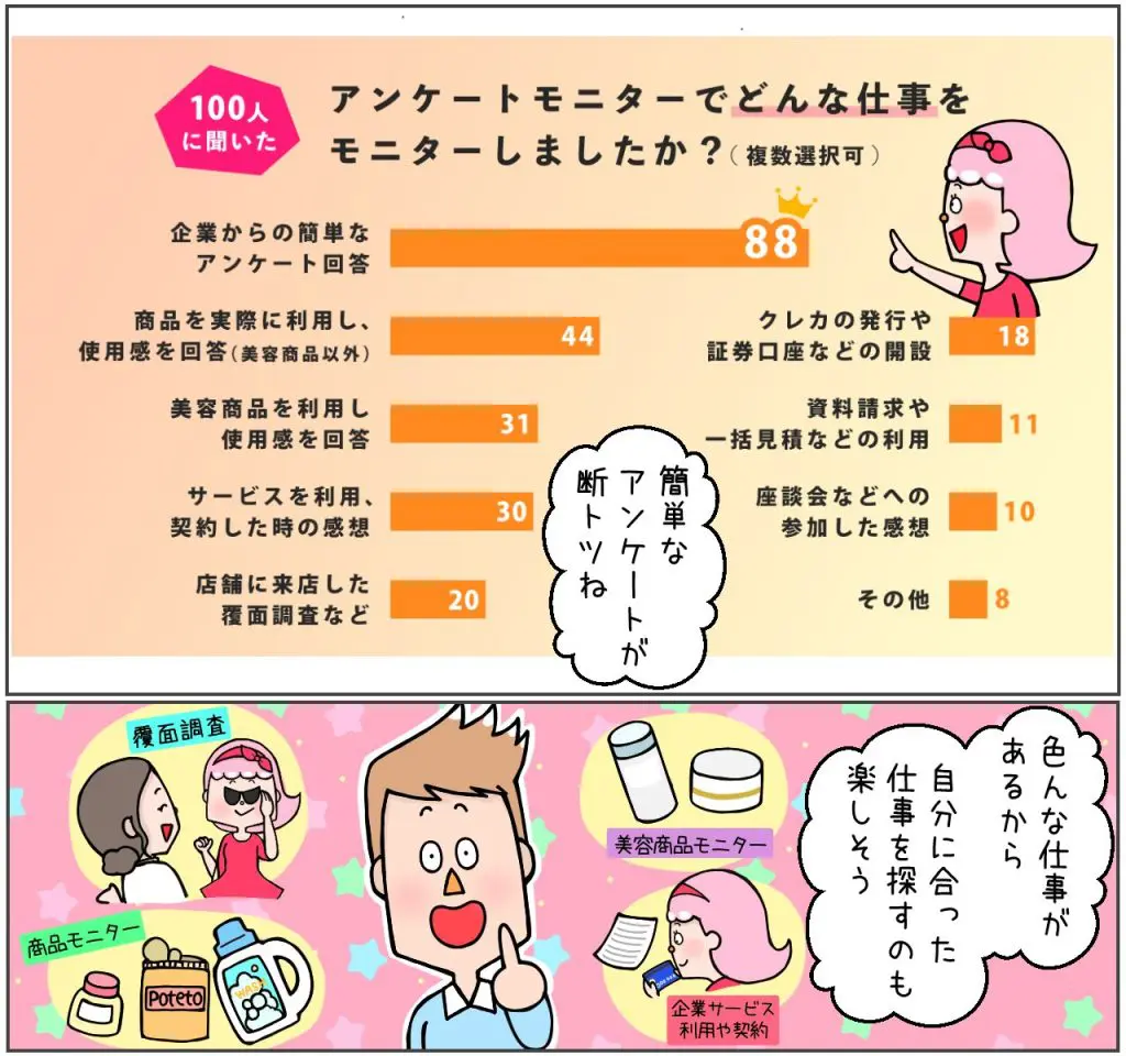 - 気軽な副収入: モニターバイトは自分の好きな時間に行える仕事であり、アンケート回答に対して報酬がもらえるため、気軽に副収入を得ることができます。